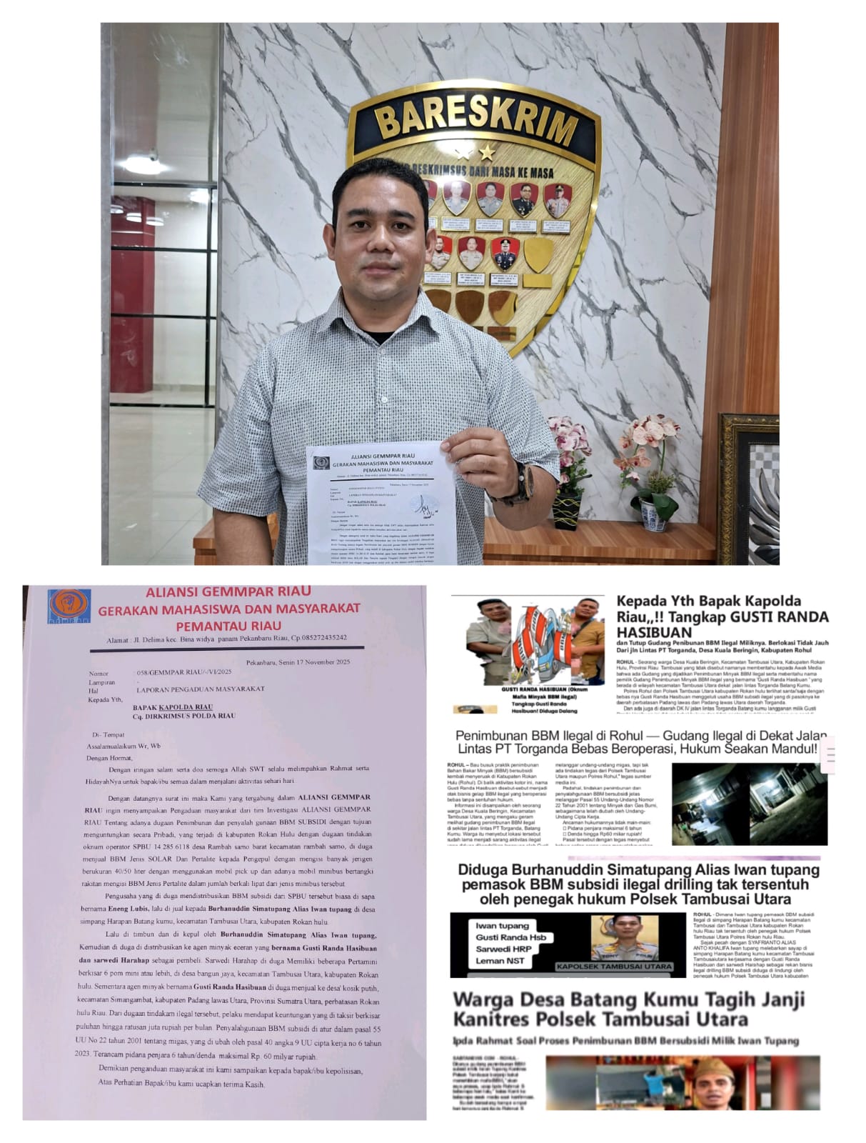 LaLu Erlangga, S.H, sebagai Ketua Aliansi GEMMPAR juga menjelaskan kepada awak media, memang “ia benar kemarin pada hari Senin, tertanggal 17 November 2025, Aliansi Gemmpar Riau, saya sendiri dan ada beberapa orang tim, bersama sama melaporkan Gustin Randa Hasibuan, Iwan Tupang, Eneng Lubis dan Sarwedi Harahap oknum mafia dan diduga Bigbos BBM Ilegal Subsidi ilegal yang di wilayah Hukum Polsek Tambusai Utara, Rokan Hulu saat ini” ungkapnya.