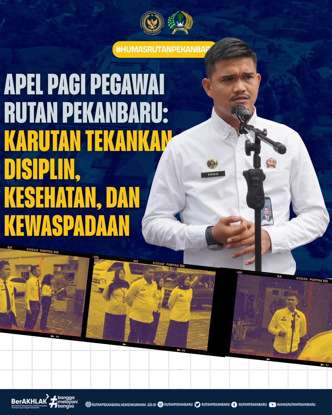 Pekanbaru – Rumah Tahanan Negara (Rutan) Kelas I Pekanbaru menggelar apel pagi rutin pada Senin (3/11/2025) yang dipimpin langsung oleh Kepala Rutan Kelas I Pekanbaru, Erwin Siregar. Apel ini diikuti oleh seluruh pegawai Rutan Pekanbaru. Kegiatan apel berlangsung dengan khidmat dan menjadi momen penting untuk memperkuat komitmen pegawai dalam menjaga kedisiplinan dan semangat kerja di lingkungan Rutan.