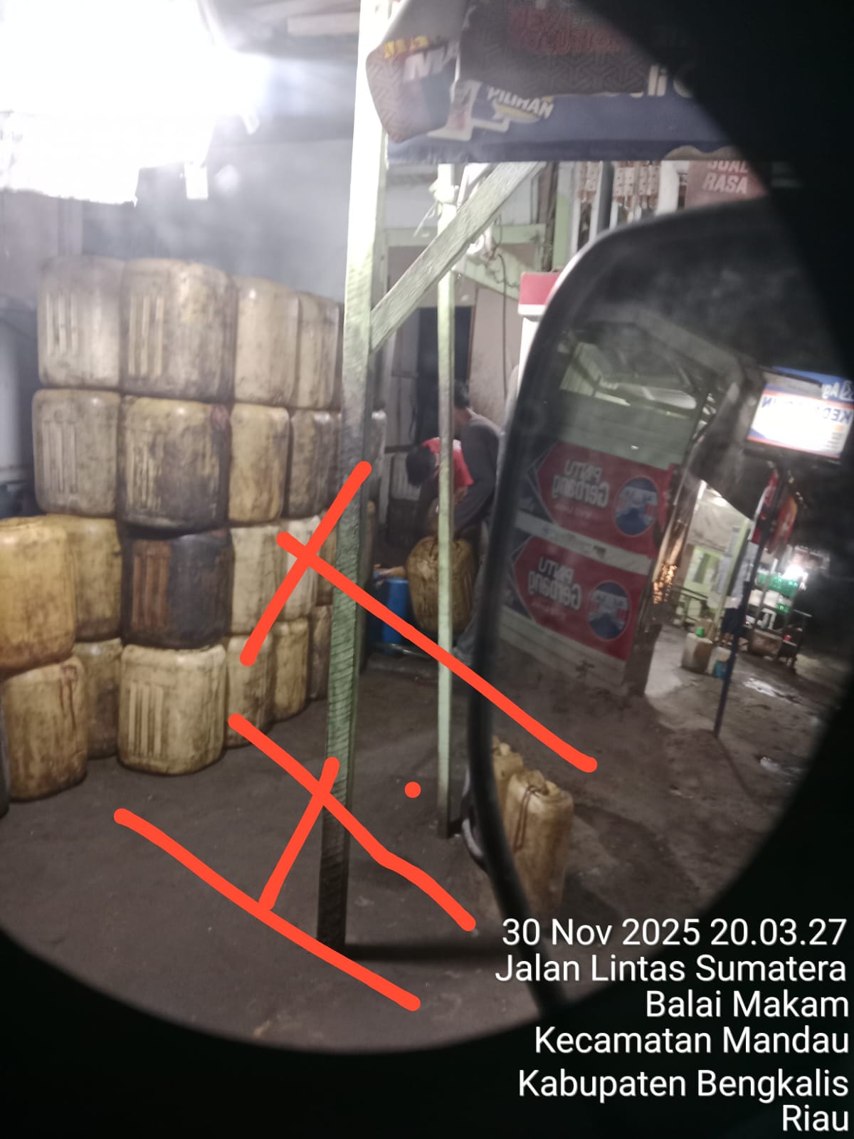 Bengkalis – Pemandangan mencolok dan meresahkan terlihat di sepanjang Jalan Lintas Sumatera, tepatnya di kawasan Balai Makam, Kecamatan Bathin Solapan, Kabupaten Bengkalis, Riau. Dalam foto yang diambil pada malam hari, 30 November 2025, pukul 20.03 WIB, terlihat tumpukan puluhan jerigen plastik berwarna kuning kecokelatan yang tampak usang dan kotor, diduga kuat menjadi tempat penampungan Bahan Bakar Minyak (BBM) secara ilegal.