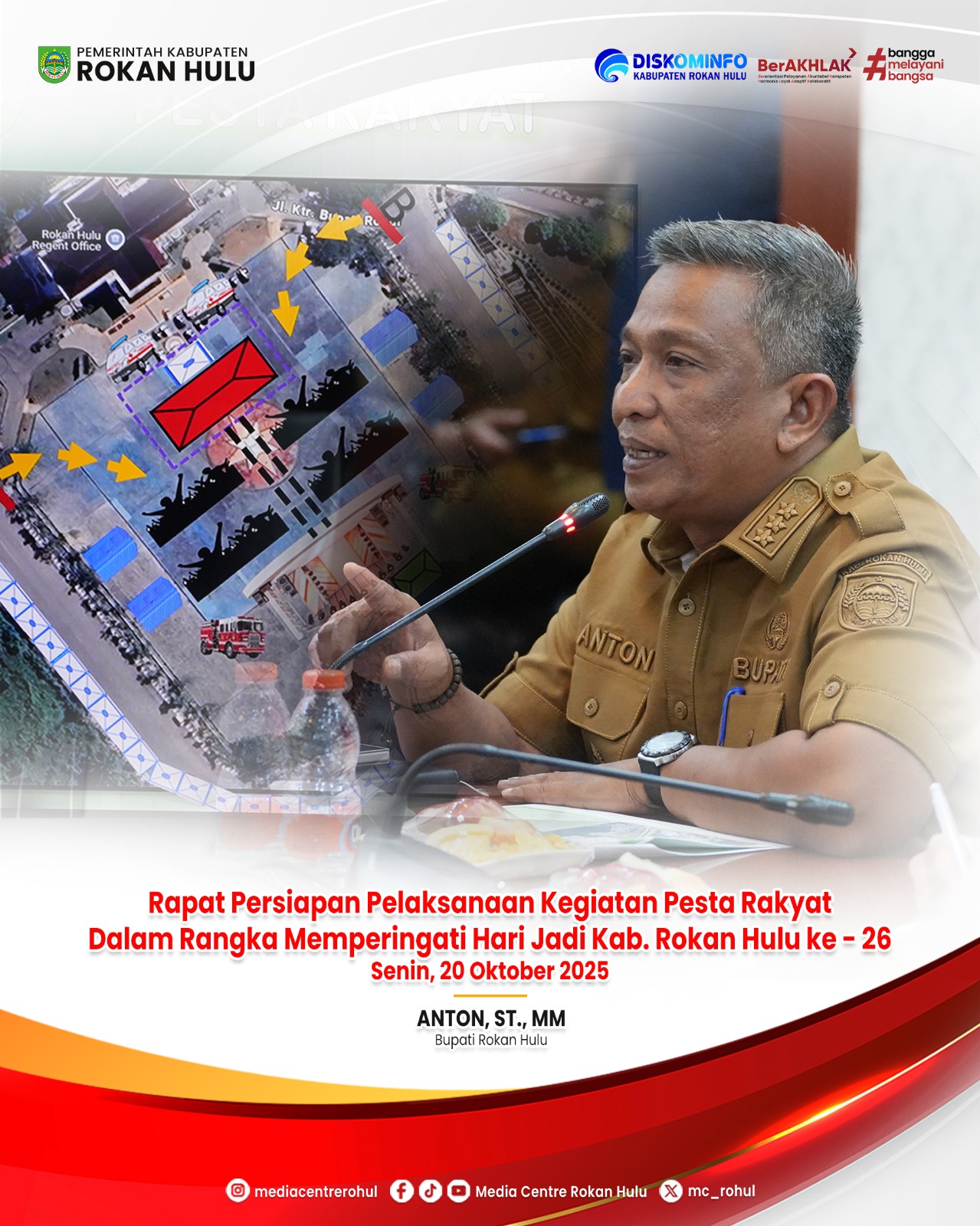Rohul | Menjelang pelaksanaan malam puncak pesta rakyat dalam rangka Hari Jadi Kabupaten Rokan Hulu (Rohul) ke-26 tahun yang berlangsung pada tanggal 25 nanti, Bupati Rohul Anton, ST, MM memimpin rapat finalisasi persiapan di Ruang rapat Rumah Dinas Bupati, Senin (20/10/2025).