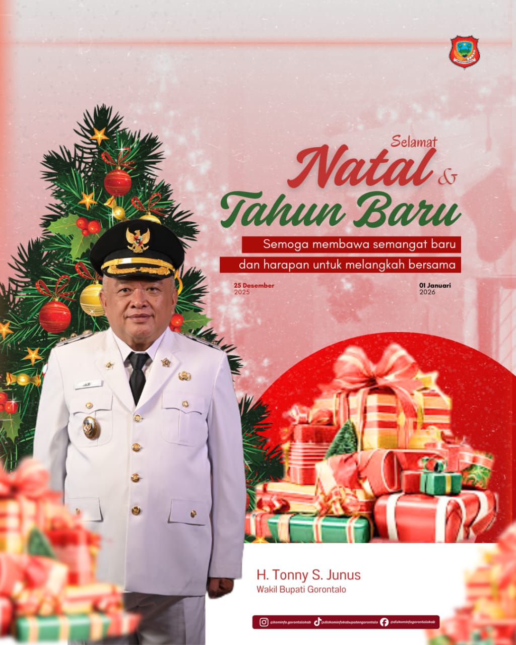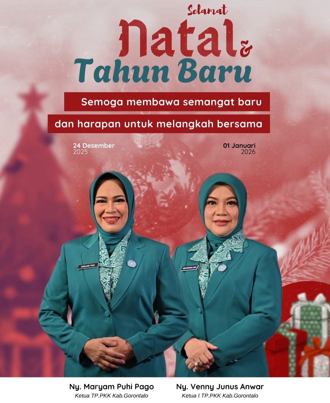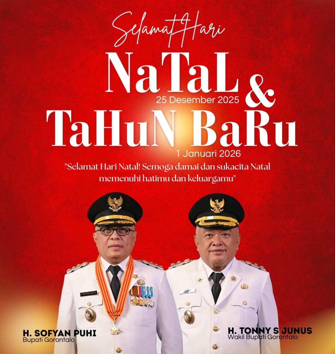 Bupati Gorontalo, H. Sofyan Puhi., St dan Wakil Bupati Gorontalo, H., Tonny S Junus bersama Ketua Tim Pembina Kesra Keluarga (PKK) Kabupaten Gorontalo, Ny. Maryam Puhi Pago dan Ny. Venny Junus Anwar Wakil Ketua Tim Pembina Kesra Keluarga (PKK) Kabupaten Gorontalo menyampaikan ucapan selamat Hari Natal 2025 kepada seluruh masyarakat Kabupaten Gorontalo. Perayaan ini menjadi momen berbagi kebersamaan di tengah libur nasional, dengan Doa agar semangat kasih Natal mempererat persatuan warga. Ia juga menekankan pentingnya nilai Natal dalam kehidupan bermasyarakat. Natal adalah hari bahagia yang mengajarkan kita tentang kasih dan toleransi. Saya ucapkan selamat Hari Natal kepada seluruh umat Kristiani dan masyarakat Gorontalo pada umumnya. Semoga tahun 2026 membawa berkah dan kemajuan bagi kita semua.”