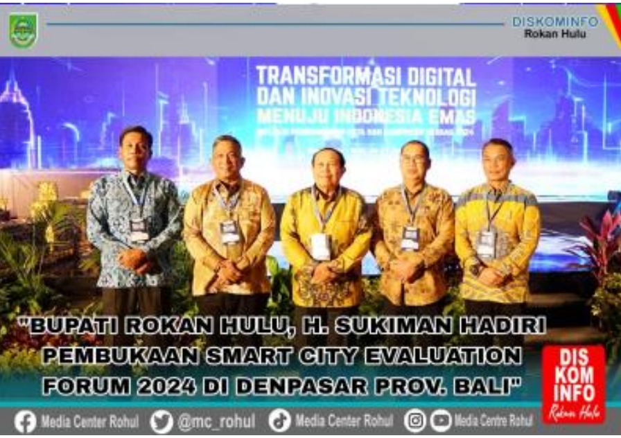 Ridarmanto,S.IP, M.IP, Plt Dinas Kesehatan drg. Septien Asmarwiati, Kabid IKP Diskominfo Rohul Rudy Fadrial, S.Sos, M.Si, Kabid Jalan dan Jembatan Khairul Fahmi, ST, Kabid Perencanaan Pembangunan Sosial Budaya dan Pembangunan Arkom,S.Si menghadiri acara pembukaan Forum Smart City 2024 di The Meru Sanur, Denpasar, Bali (Senin,24/06/2024).