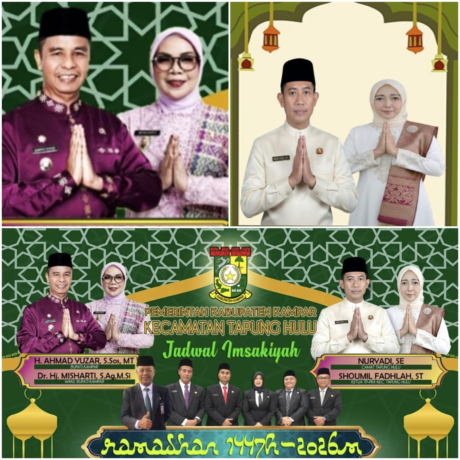 KAMPAR – Menyambut datangnya Bulan Suci Ramadhan 1447 Hijriah/2026 Masehi, Camat Tapung Hulu Nuryadi, SE bersama istri tercinta Shoumil Fadhlah, ST selaku Ketua TP-PKK Kecamatan Tapung Hulu, menyampaikan ucapan selamat menunaikan ibadah puasa kepada seluruh masyarakat, khususnya warga Kecamatan Tapung Hulu.