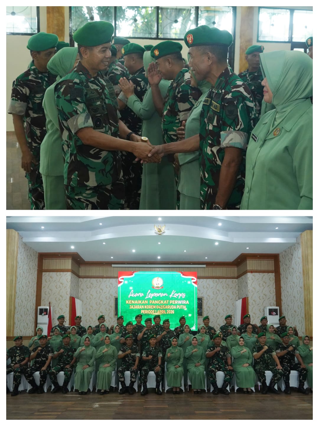 JAMBI – Komandan Korem 042/Gapu Brigjen TNI Nyamin, S.I.P., M.M. memimpin langsung Laporan Korp Kenaikan Pangkat Perwira jajaran Korem 042/Gapu periode 1 April 2026 di Aula Balai Prajurit Makorem 042/Gapu, Pada Selasa (07/04/2026).