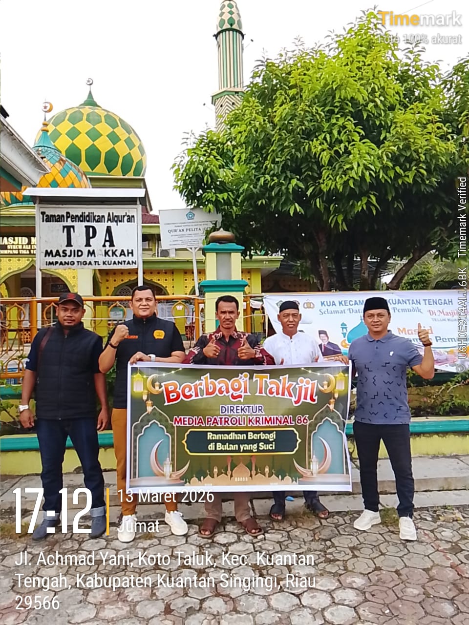 Kegiatan sosial ini dilaksanakan di depan Masjid Mekah, Kelurahan Simpang Tiga, Kecamatan Kuantan Tengah, Kabupaten Kuantan Singingi, pada Jumat (13/03/2026).