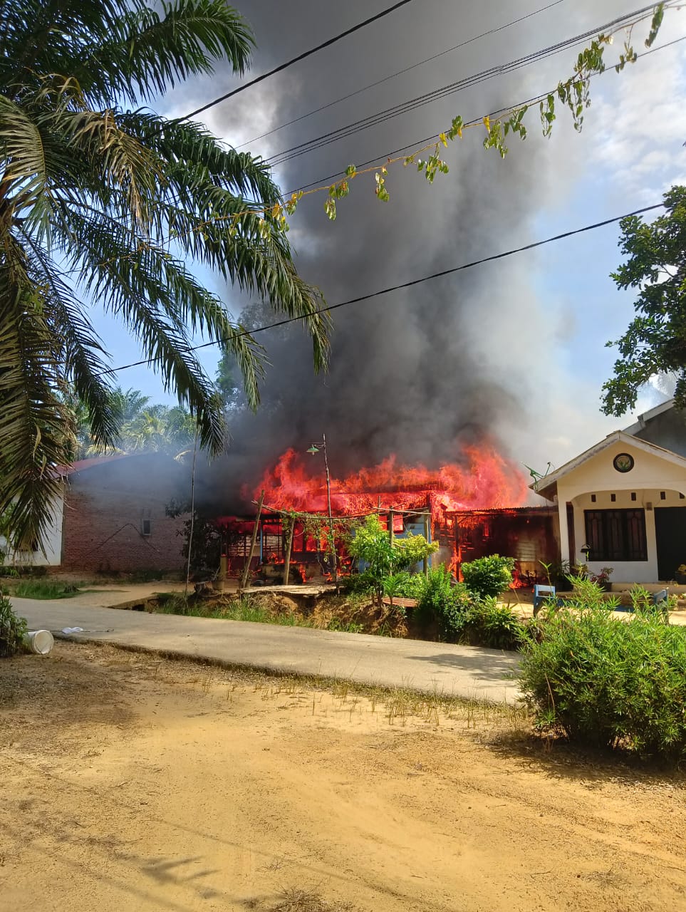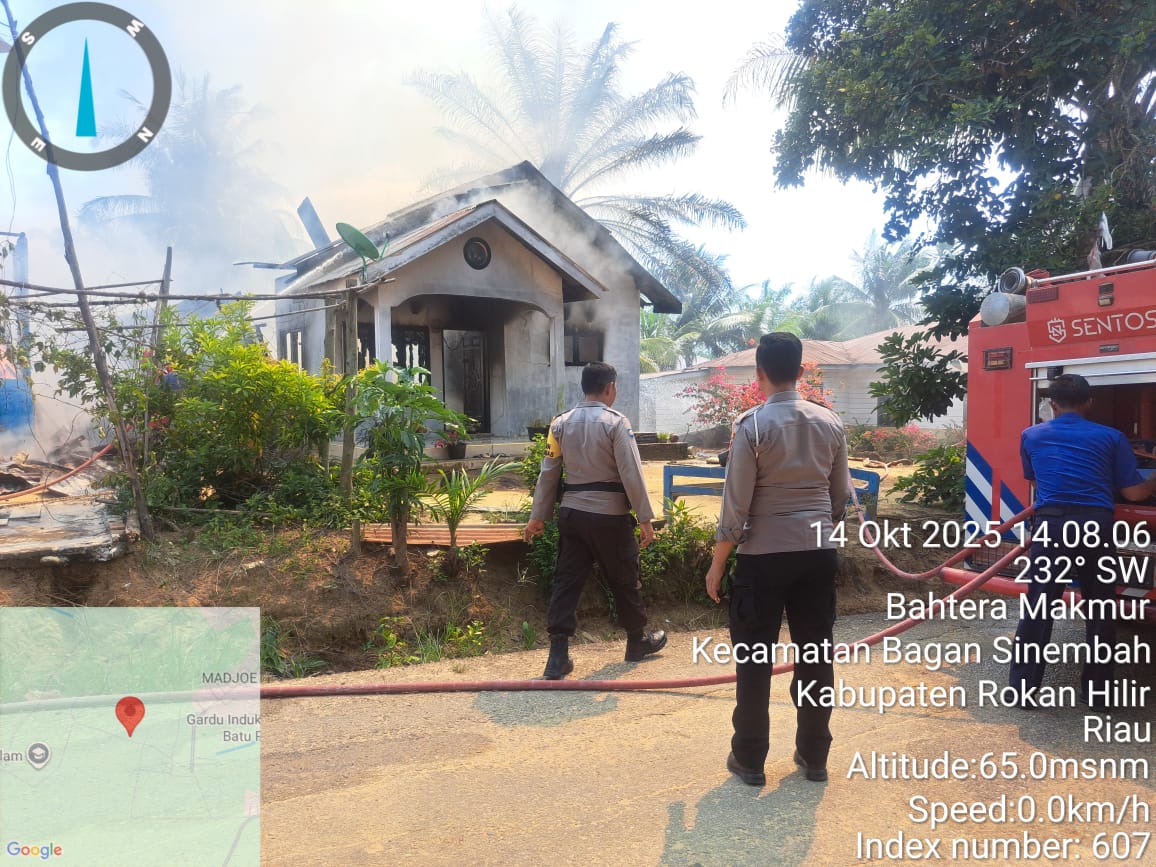 Rokan Hilir – Kebakaran hebat melanda dua unit rumah warga di Jl. Perladangan RT 001 RW 004, Dusun Simpang Pujud I, Kepenghuluan Bahtera Makmur, Kecamatan Bagan Sinembah, Kabupaten Rokan Hilir, pada Senin (14/10/2025) sekitar pukul 13.50 WIB.
