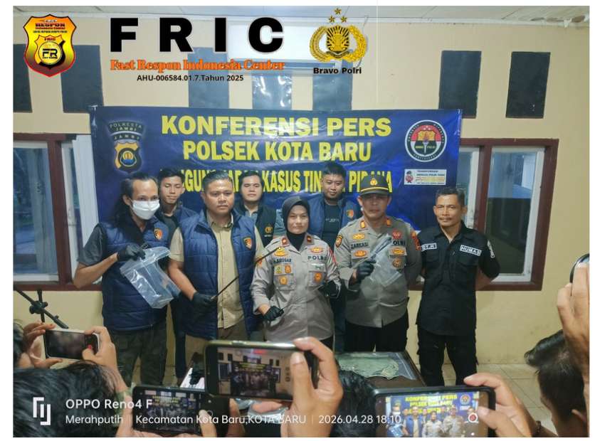 Kota Jambi – Tidak menunggu lama berkat kerja keras tim Macan Reskrim Polsek kota baru pelaku pembunuhan sadis terhadap Indra Kusuma yang tewas dengan 18 luka tusuk serta anak korban M.Ferdi turut mengalami 5 tusukan namun masih bisa tertolong. berhasil ditangkap, kejadian di Jalan Kurnia RT 10 Pinang Merah Kecamatan Alam Barajo Kota Jambi pada Minggu malam tanggal 26 April 2026