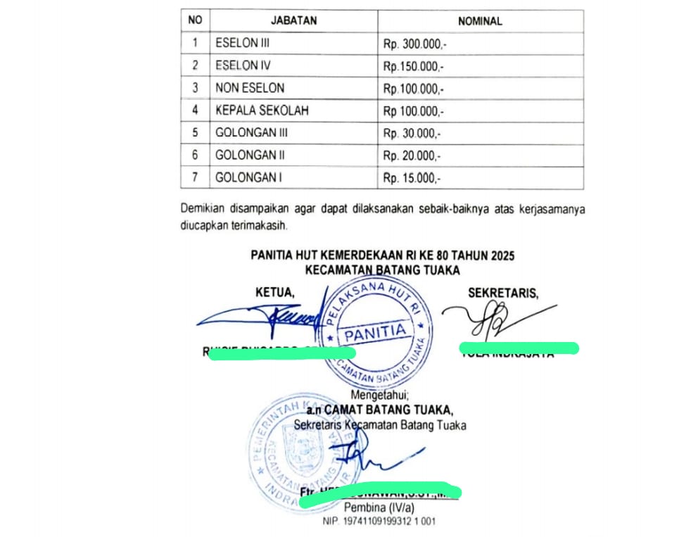 Hingga berita ini diturunkan, belum ada pernyataan resmi dari pihak panitia HUT RI ke-80 maupun Sekretaris Kecamatan Batang Tuaka yang tercantum dalam surat tersebut.(m)