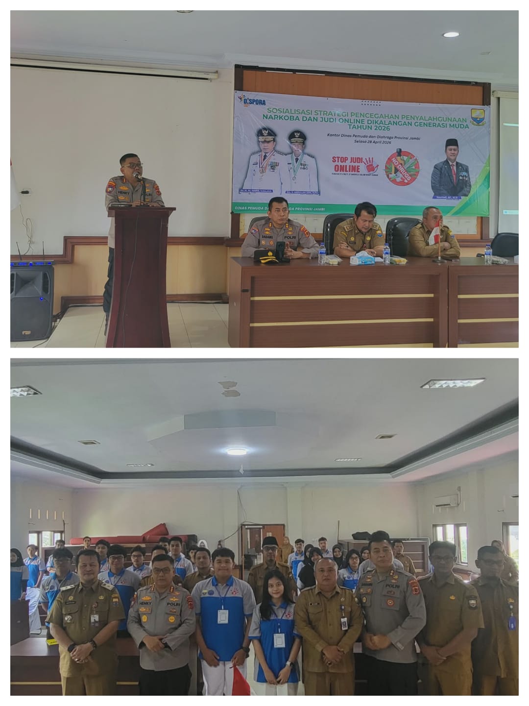 Jambi – Upaya membentengi generasi muda dari pengaruh negatif perkembangan zaman terus diperkuat. Polda Jambi melalui Direktorat Binmas bersama Dinas Pemuda dan Olahraga (Dispora) Provinsi Jambi menggelar kegiatan Pembukaan Sosialisasi Strategi Pencegahan Penyalahgunaan Narkoba dan Judi Online di Kalangan Generasi Muda Tahun 2026, Selasa (28/04/2026).