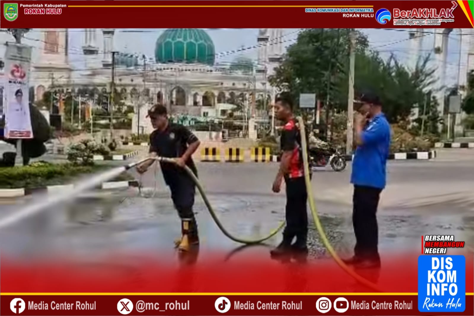 Kegiatan pembersihan dimulai dari area Kantor Bupati Rokan Hulu hingga kawasan Puja Sera Pasir Pengaraian, yang menjadi jalur utama kegiatan dan pusat aktivitas masyarakat. Petugas Damkar dengan sigap menyiram badan jalan untuk menghilangkan debu dan kotoran yang menempel, sehingga jalan terlihat lebih bersih dan nyaman dilewati.