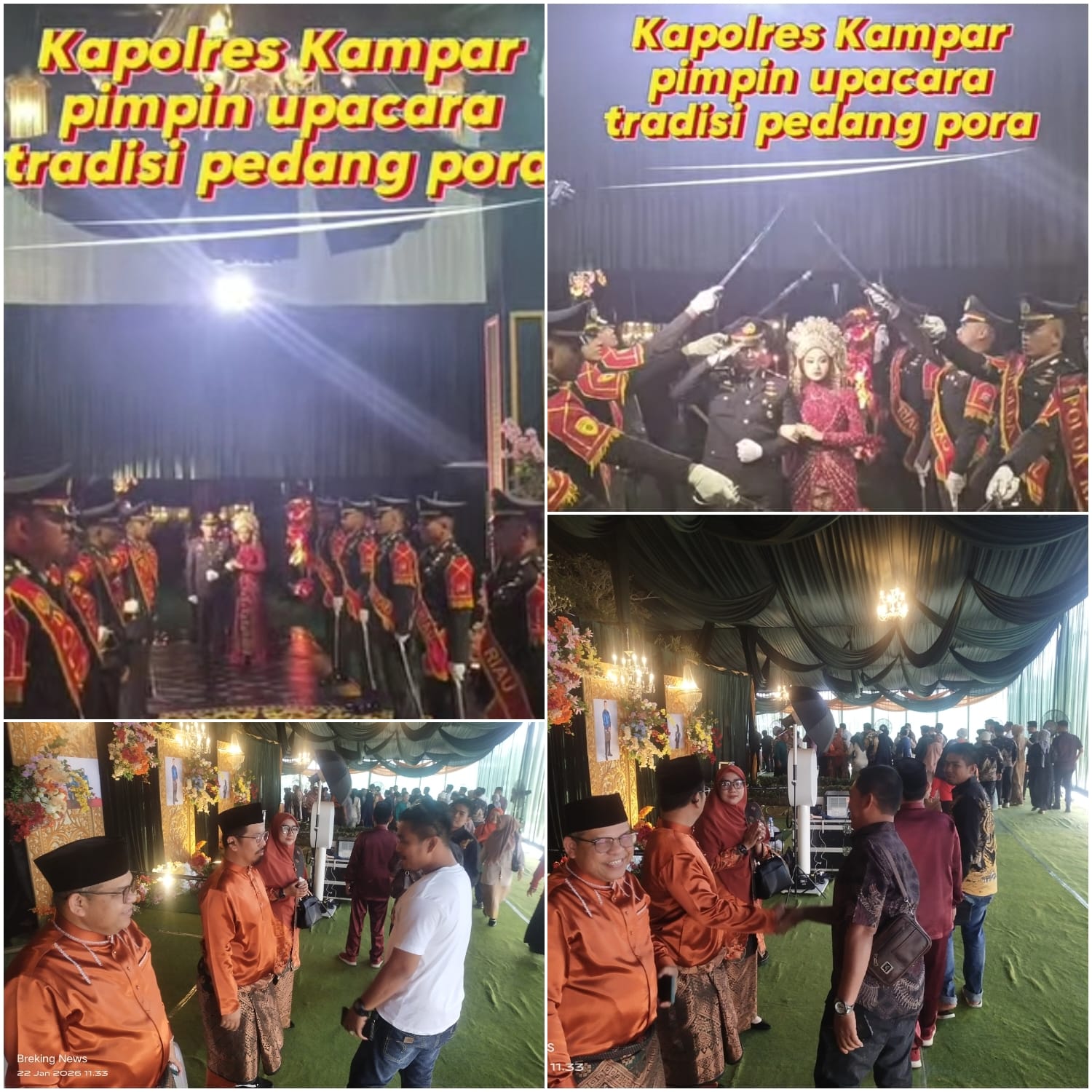 Bangkinang Kota – Suasana penuh kebahagiaan dan khidmat menyelimuti prosesi pernikahan Wahyu Ramadhan, S.Tr.K., M.Sc dengan Adzra Kalsum, S.Psi, yang digelar di Bangkinang Kota, Kamis (22/1/2026). Acara sakral ini semakin istimewa dengan pelaksanaan tradisi pedang pora yang dipimpin langsung oleh Kapolres Kampar AKBP Boby Putra Ramadhan S, bersama jajaran Polres Kampar dan Bupati Kampar H. Ahmad Yuzar, S.Sos, MT.