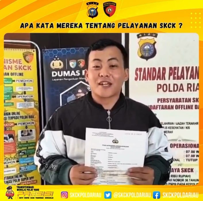 “Terimakasih Pelayanan SKCK Polda Riau, yang telah membantu saya mendapatkan SKCK, pengajuan yang mudah dan cepat,.. hingga masyarakat dengan KTP diluar Provinsi Riau yang saat ini telah bisa memperoleh SKCK di loket pelayanan SKCK Polda Riau ucap beberapa masyarakat pemohon SKCK.