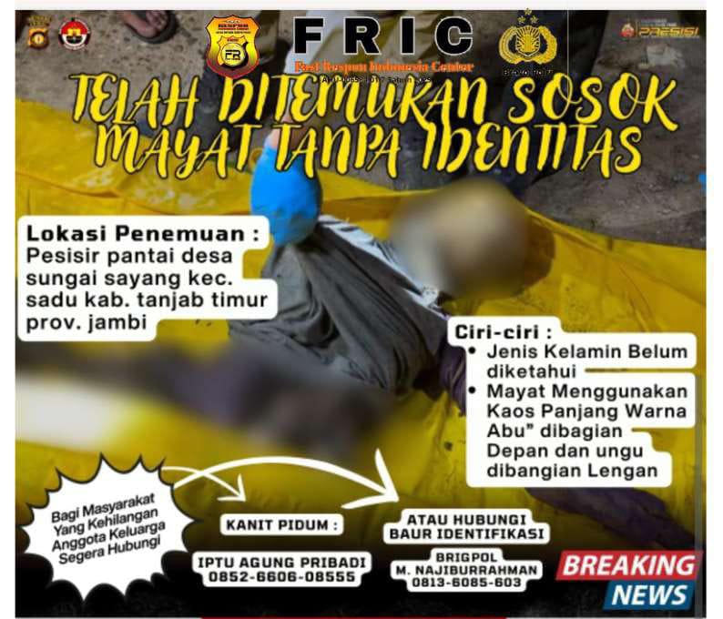 Penyelidik Sat Reskrim Polres Tanjung Jabung Timur menghimbau kepada masyarakat Provinsi jambi dan masyrakat diluar Provinsi Jambi khususnya diwilayah Kab. Tanjung Jabung Timur jika ada keluarganya yang kehilangan anggota keluarga segera menghubungi Polres Tanjung Jabung Timur di no call center 110 atau menghubungi langsung Kasat Reskrim Polres Tanjung Jabung Timur Akp. A.Soekany Daulay Hp. 082282159776, Kanit Pidum Sat Reskrim Polres Tanjung Jabung Timur ipda Agung Pribadi Hp.0852-6606-0855 dan Baur Identifikasi Sat Reskrim Polres Tanjung Jabung Timur Brigpol M. Najiburrahman Hp.0813-6085-603 karena untuk sementara ini identitas korban belum dapat diketahui.