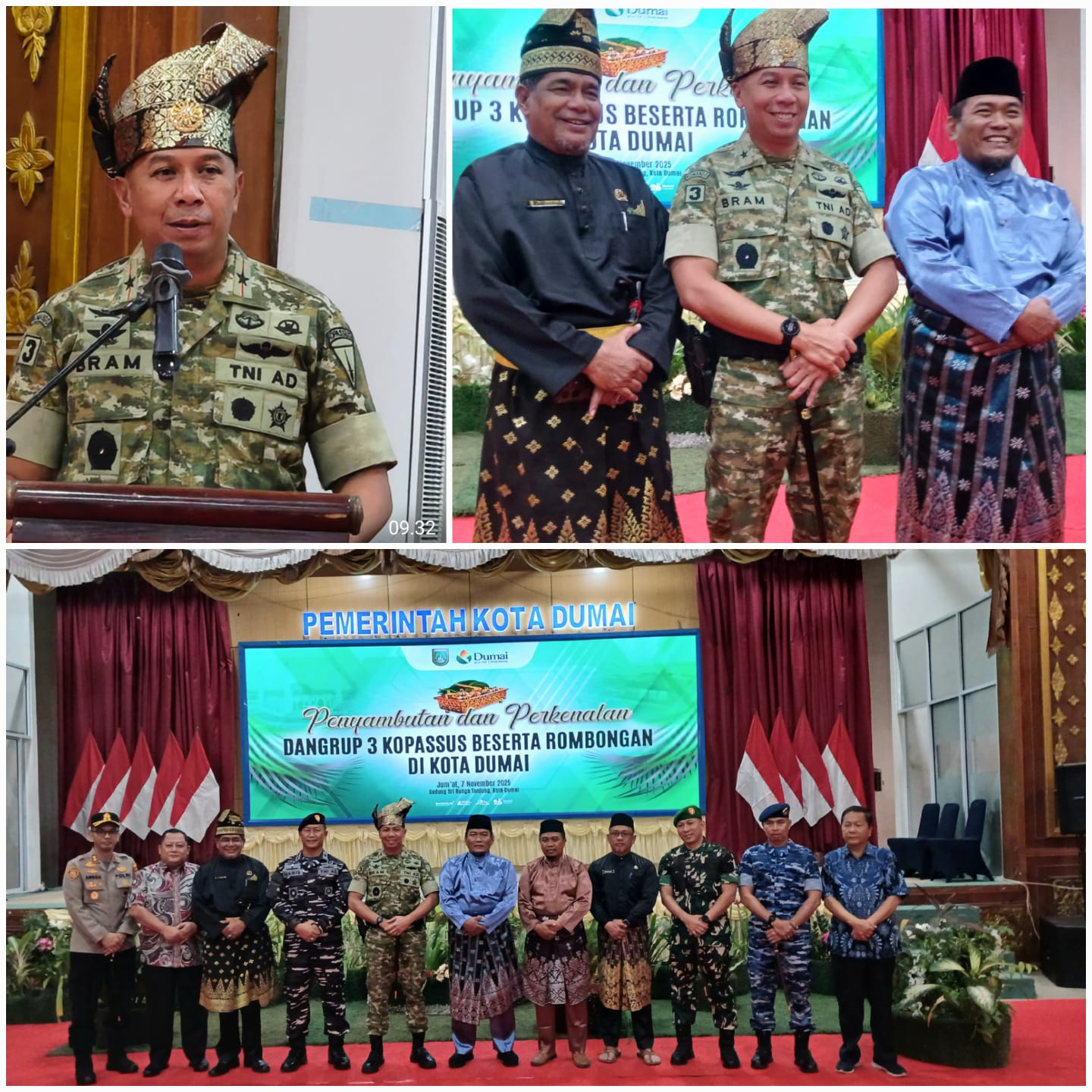 Pemerintah Kota Dumai menggelar acara “Penyambutan dan Perkenalan Komandan Grup 3 Kopassus Beserta Rombongan” di Balai Sri Bunga Tanjung, Kantor Wali Kota Dumai. Kegiatan berlangsung khidmat dan penuh kehangatan, diwarnai dengan penampilan budaya khas Melayu serta dihadiri oleh jajaran Forkopimda, Lembaga Kerapatan Masyarakat Riau (LKMR), dan tokoh masyarakat Dumai.