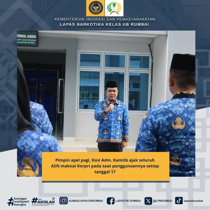 Pekanbaru – Kepala Seksi Administrasi Keamanan dan Ketertiban, Edoward Nikelini Bangun bertindak sebagai pembina yang ikut serta didalamnya pejabat struktural dan dihadiri oleh seluruh ASN lingkup Kantor Lapas Narkotika Kelas IIB Rumbai, Senin (17/11/2025).