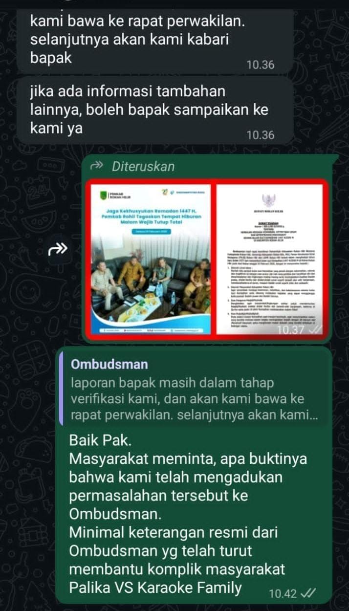 Menanggapi dinamika tersebut, Riky, pengamat sosial lokal Provinsi Riau, bersama dua perwakilan masyarakat Palika mengajukan pengaduan ke Ombudsman RI.