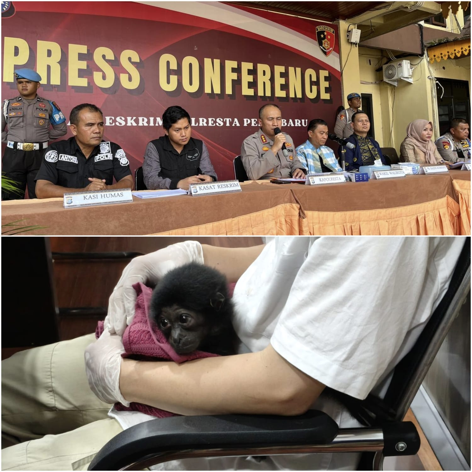 Pekanbaru – Satreskrim Polresta Pekanbaru mengungkap perdagangan satwa dilindungi jenis owa siamang. Seorang pelaku yang memperdagangkan hewan primata itu diamankan.