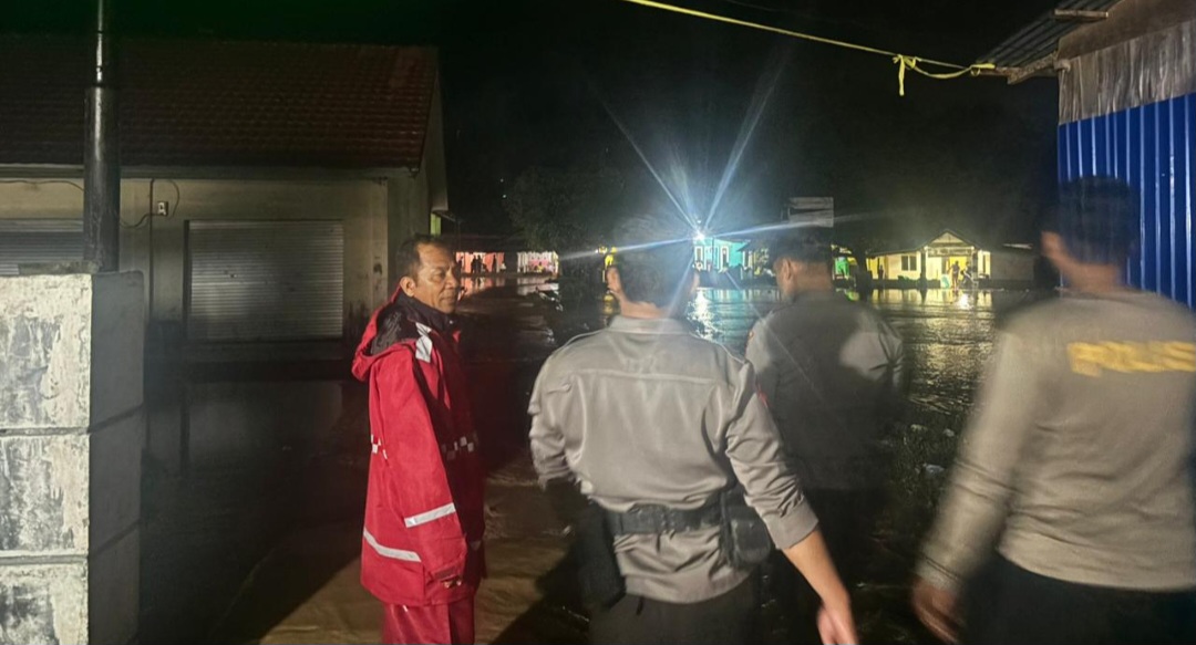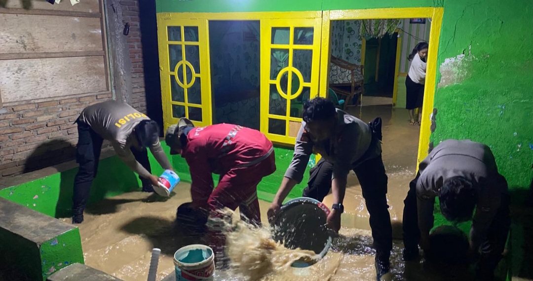 Personel Satuan Samapta (Sat Samapta) Polres Gorontalo dengan sigap menanggulangi bencana banjir yang melanda Kecamatan Tibawa, Desa Datahu, pada Jumat (19/12/2025) malam.