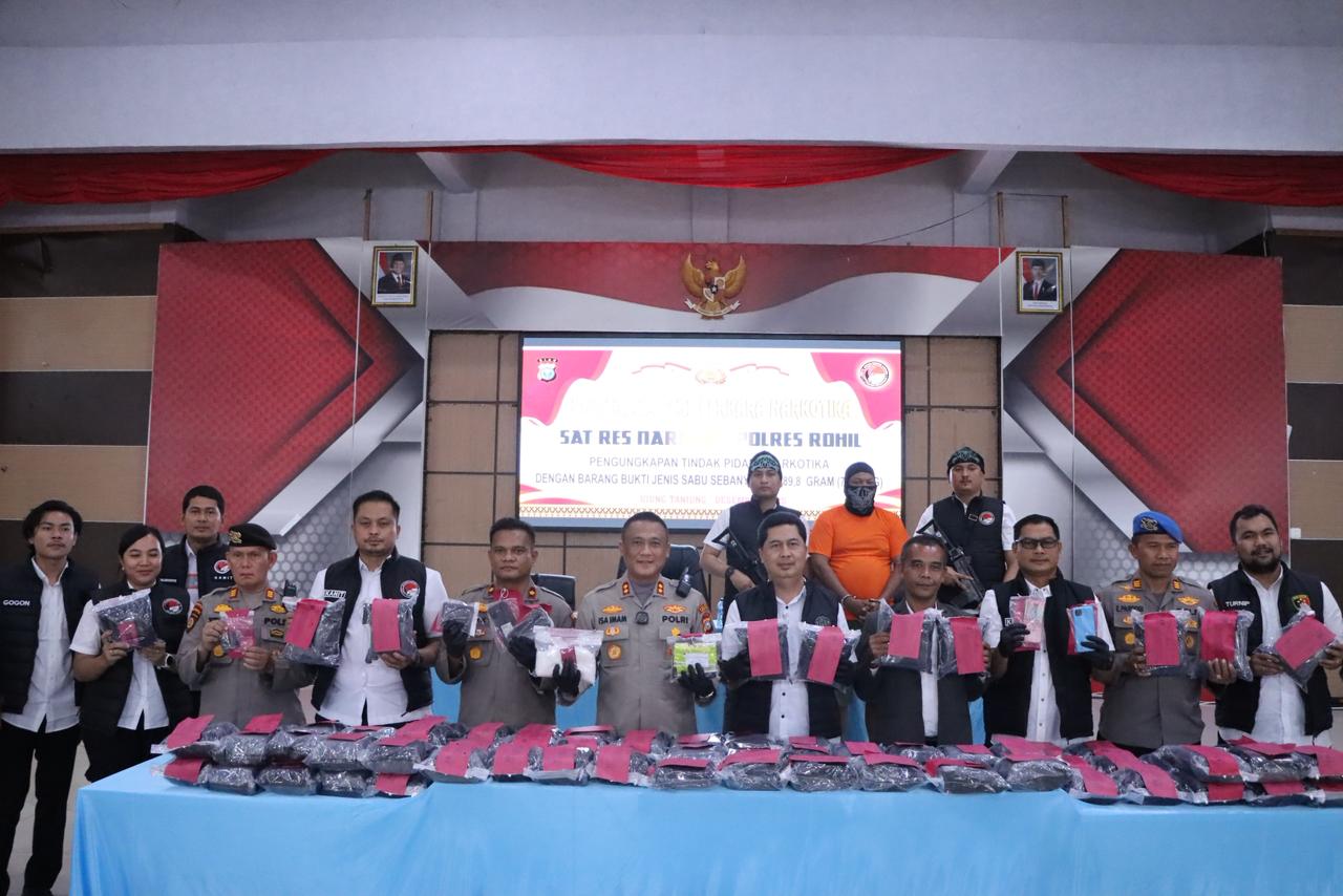 Konferensi pers dipimpin oleh Wadir Ditresnarkoba Polda Riau AKBP Nandang Lirama, didampingi Kapolres Rokan Hilir AKBP Isa Imam Syahroni, S.I.K., M.H., serta jajaran pejabat utama Polres Rohil dan awak media.