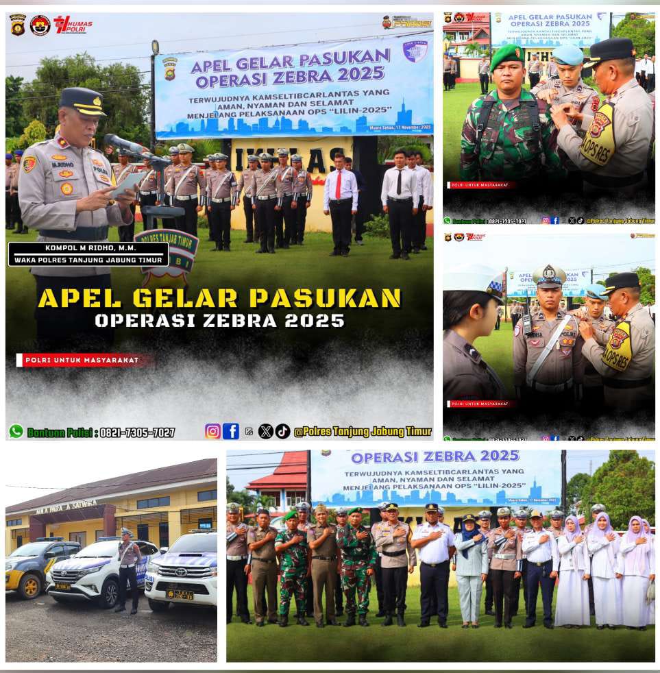 Tanjung Jabung Timur – Menjelang Operasi Lilin 2025, Polres Tanjung Jabung Timur gelar Operasi Zebra Siginjai 2025 dengan tema “Terwujudnya Kamseltibcarlantas Aman, Nyaman dan Selamat” bertempat di lapangan apel Mako Polres Tanjab Timur, Senin (17/11/2025).