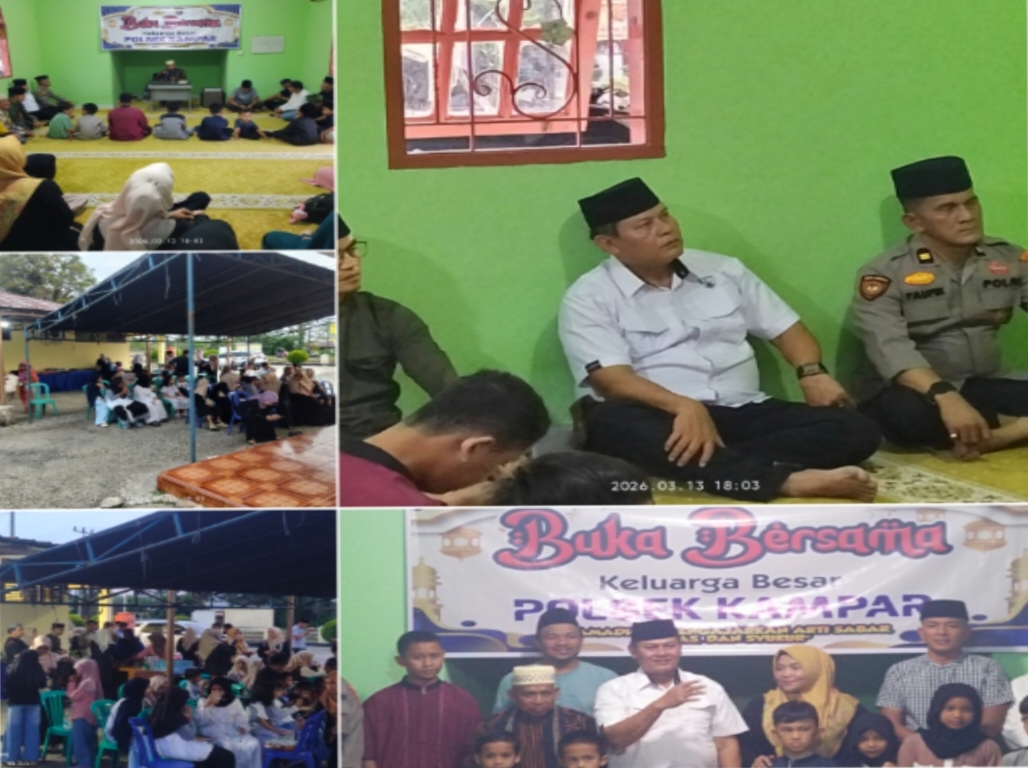 Kampar – Suasana penuh kehangatan dan kebersamaan terasa begitu kental di lingkungan Polsek Kampar, Kecamatan Kampar, Jumat (13/3/26). Dalam semangat berbagi di bulan suci Ramadhan 1447 Hijriah, Polsek Kampar menggelar kegiatan buka puasa bersama anak-anak yatim dan insan pers, sebagai wujud kepedulian sosial sekaligus mempererat tali silaturahmi dengan masyarakat.
