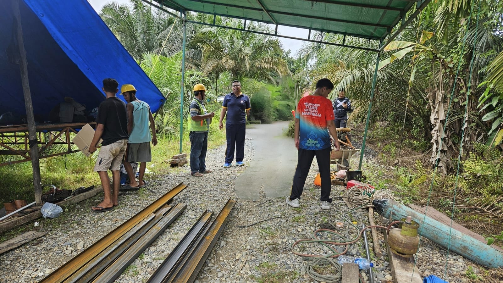 Jembatan yang direncanakan memiliki panjang 18,5 meter dan lebar 4 meter ini tengah mengalami tahap awal pembangunan. Kegiatan yang dilakukan pada hari ini meliputi pembongkaran dan pemindahan material besi, antara lain 21 lembar besi pelat polos, 6 lembar besi pelat bunga, dan 18 lembar besi UMP 100. Selain itu, tim kontraktor juga melakukan pengukuran untuk pembuatan mal rangka jembatan serta pemotongan dan pengelasan besi UMP 100 untuk struktur rangka utama.