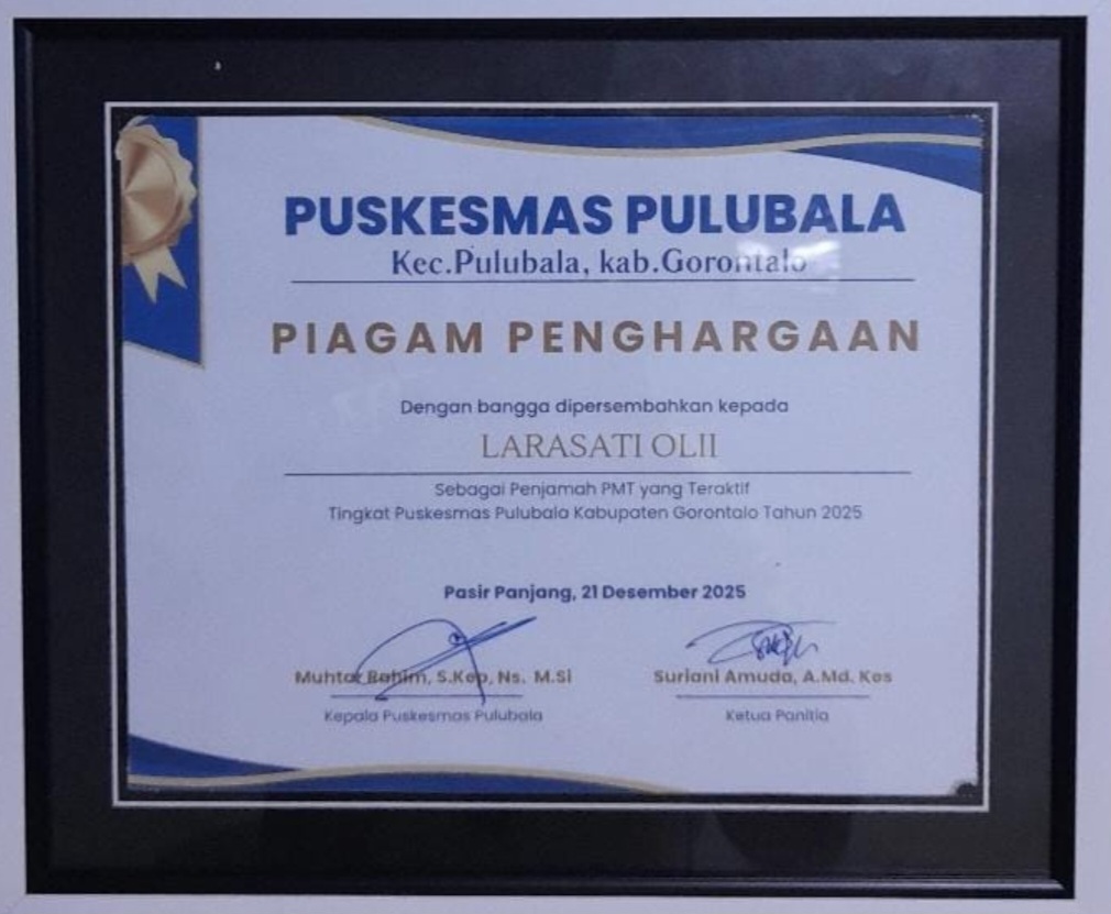Kepala Puskesmas Pulubala, Muhtar I. Rahim, S.Kep. Ns. M.Si, memberikan penghargaan istimewa kepada 10 kader penjamah PMT Lokal di wilayah kerjanya. Penghargaan ini diserahkan sebagai bentuk apresiasi atas dedikasi mereka dalam mendistribusikan PMT (Pemberian Makanan Tambahan) siap saji langsung ke rumah-rumah sasaran, khususnya bagi balita dan ibu hamil rentan gizi. Selasa (23/12/2025).