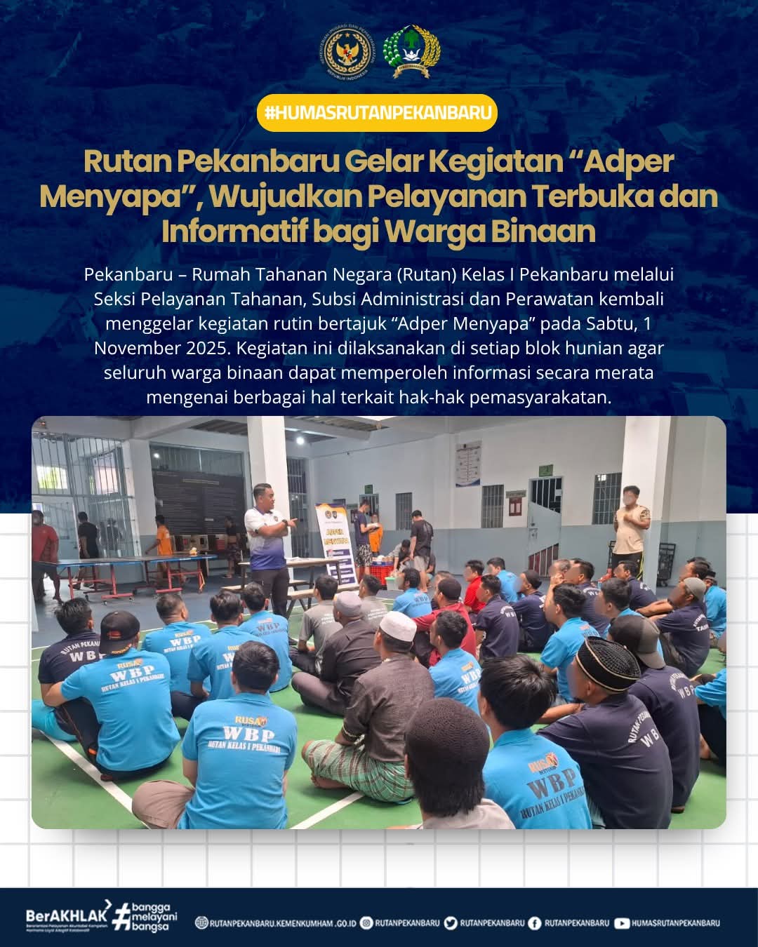 Pekanbaru – Rumah Tahanan Negara (Rutan) Kelas I Pekanbaru melalui Seksi Pelayanan Tahanan, Subsi Administrasi dan Perawatan kembali menggelar kegiatan rutin bertajuk “Adper Menyapa” pada Sabtu, 1 November 2025. Kegiatan ini dilaksanakan di setiap blok hunian agar seluruh warga binaan dapat memperoleh informasi secara merata mengenai berbagai hal terkait hak-hak pemasyarakatan.