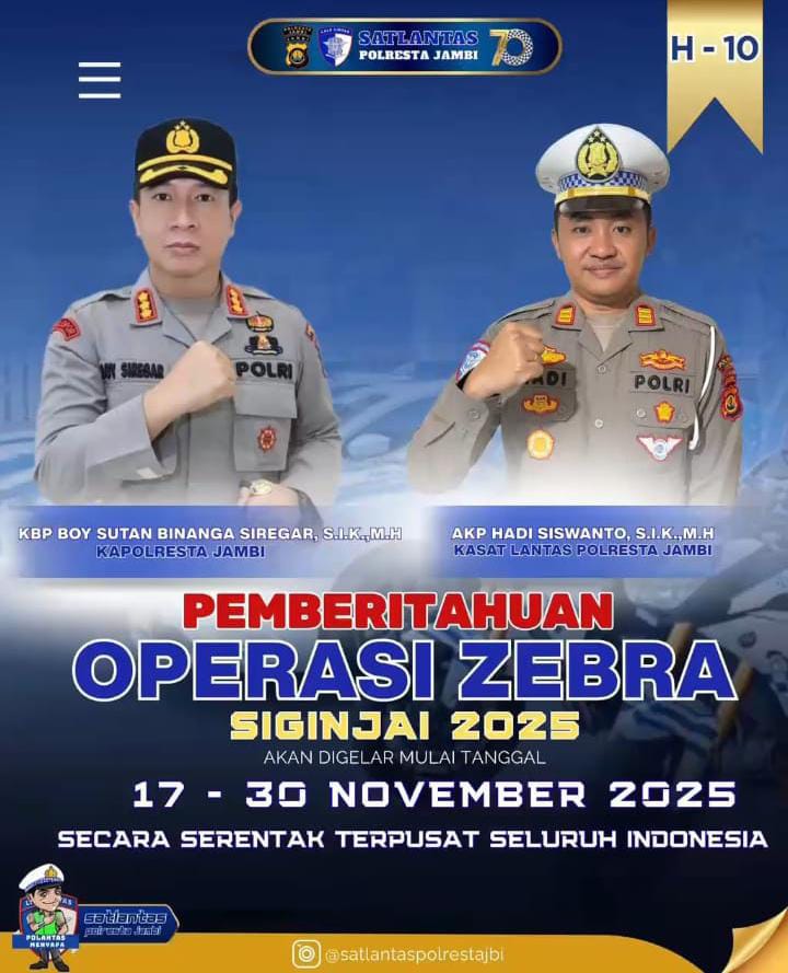 Kota jambi – Satlantas polresta kota jambi, provinsi jambi akan menggelar acara kegiatan operasi zebra siginjai yang di gelar secara serentak terpusat di seluruh indonesia tahun 2025.