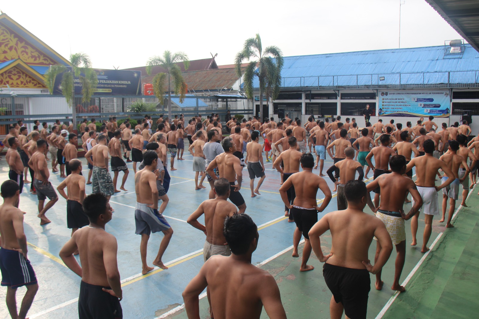 Pekanbaru, – Ratusan warga binaan Lembaga Pemasyarakatan (Lapas) Kelas IIA Pekanbaru mengikuti kegiatan senam pagi yang dilaksanakan di lapangan dalam Lapas, Jumat (23/01).