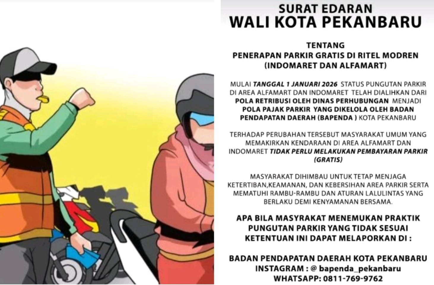 Surat edaran Walikota Pekanbaru Terkait parkir di retail modren Alfamart dan Indomaret berlaku mulai tanggal 1 Januari 2026, kami berharap surat edaran tersebut berlaku juga untuk kami Pengusaha lokal, demi kemajuan usaha lokal dan kemajuan ekonomi pengusaha lokal, tutup Narasumber.