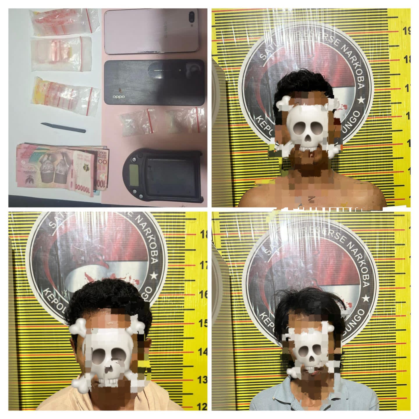 Ketiga terduga pelaku masing-masing berinisial E.S (27), J.P (33), dan A.I (34). Dari tangan para pelaku, polisi menyita sejumlah barang bukti berupa dua paket plastik klip berisi kristal bening diduga sabu dengan berat bruto 4,45 gram, tiga plastik klip kosong, satu sendok sabu, satu timbangan digital, satu alat hisap (bong), serta dua unit telepon genggam.