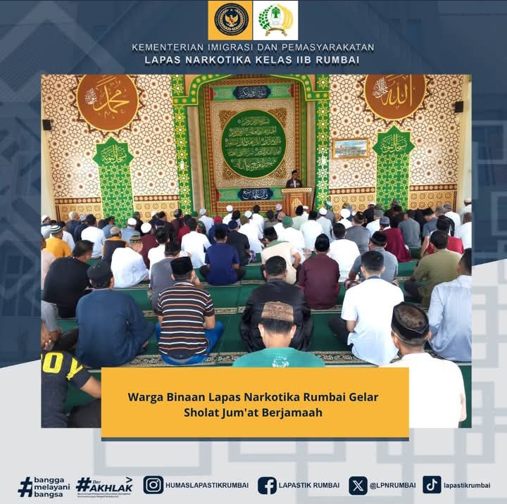Rumbai – Warga Binaan Lembaga Pemasyarakatan Narkotika Kelas IIB Rumbai yang beragama Islam yaitu melakukan Sholat Jum’at berjamaah di Masjid At-taubah Lapas Narkotika Rumbai, Jum’at (3/10/2025).